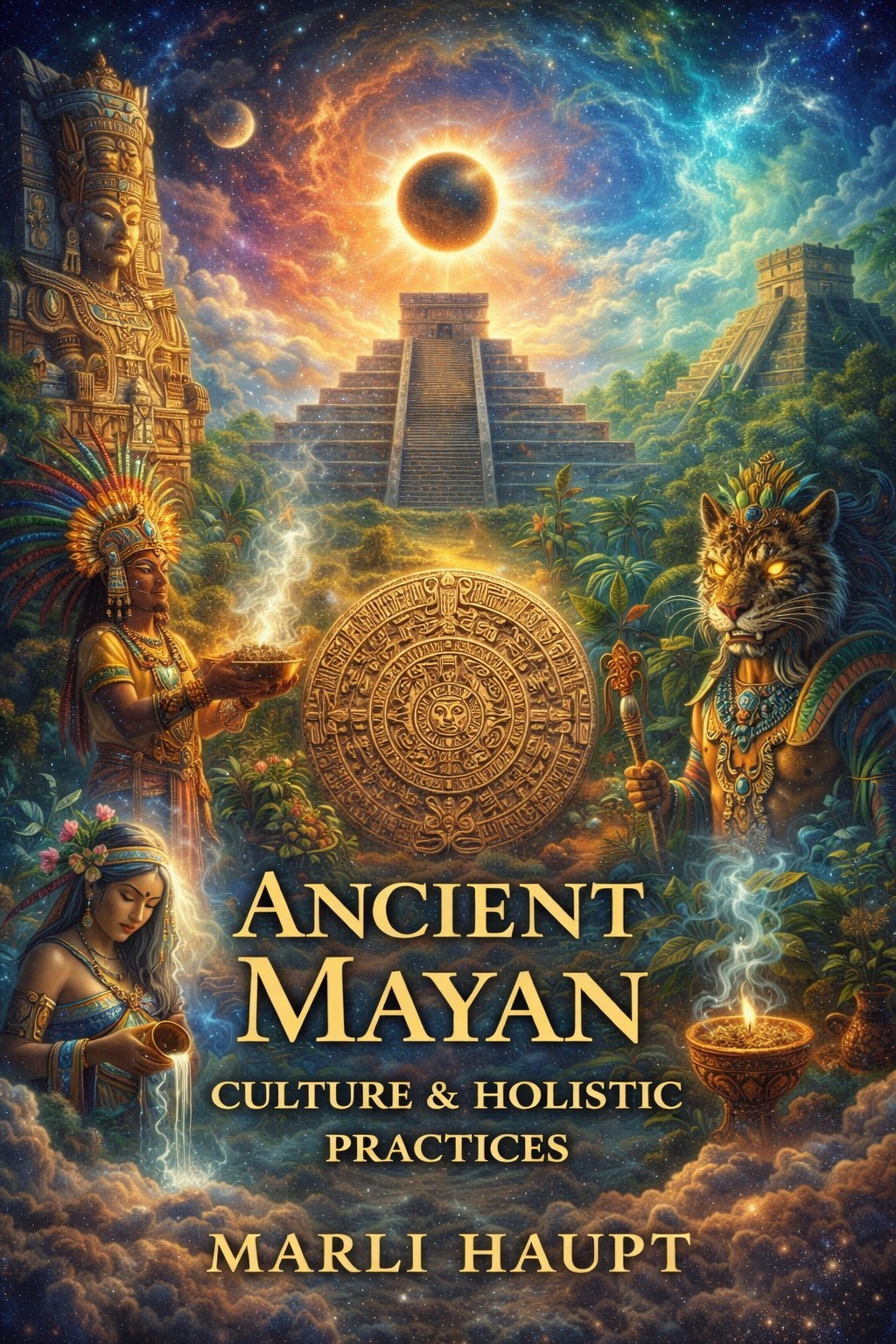 Culture and civilization. Maya cosmos. Architectural achievements, medicinal practices, herbal healing. Writing system. Sacred ceremonies, beliefs and creation myths. Shamanic traditions. Holistic health, attunements, reiki. Ixchel. Empowerment. Deities. Mythological creatures. 2012.