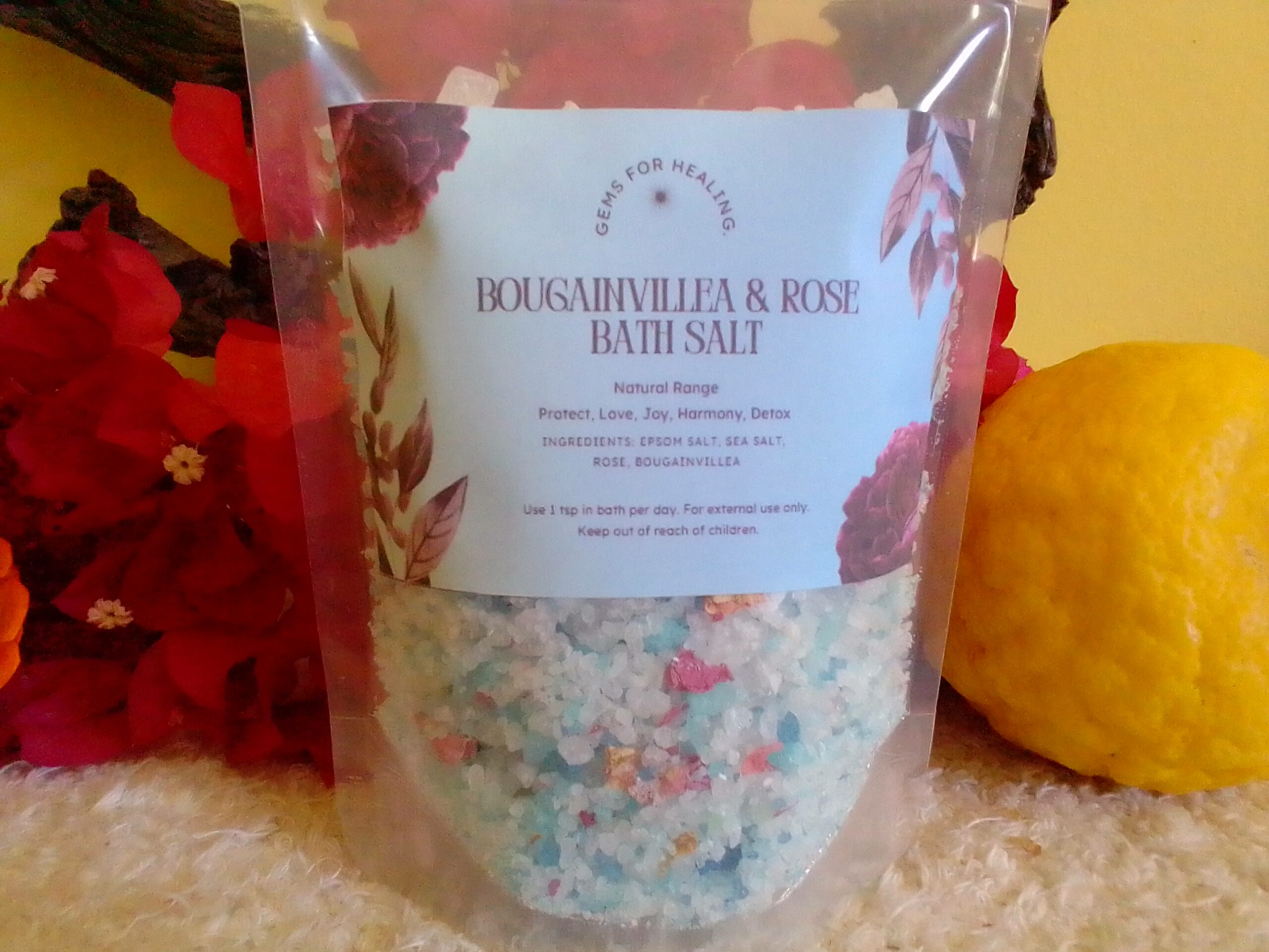 Immerse yourself in a soothing floral bath with our Bougainvillea & Rose Bath Salt. Crafted from a rejuvenating blend of Sea Salt and Epsom Salt, and enhanced with a touch of light blue sea salt (naturally colored with food-grade colorant), this bath soak helps relax the body, calm the mind, and nourish the skin. The floral energy of Bougainvillea inspires joy and vitality, while Rose opens the heart to love and emotional balance.