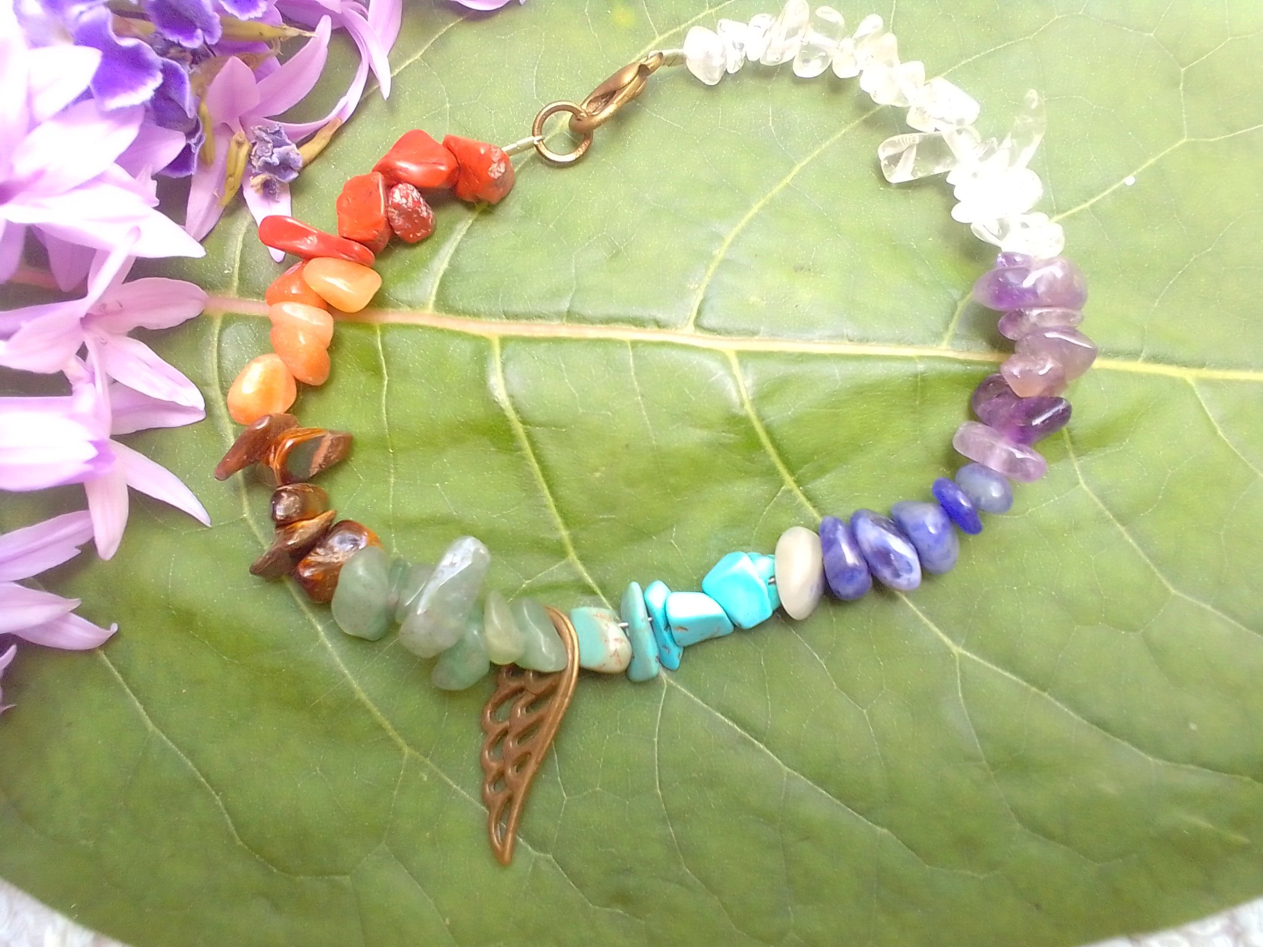 Embrace balance, protection, and divine love with the Chakra Chip Stone Bracelet with Angel Wing. A stunning accessory for enhancing your spiritual journey and emotional well-being.