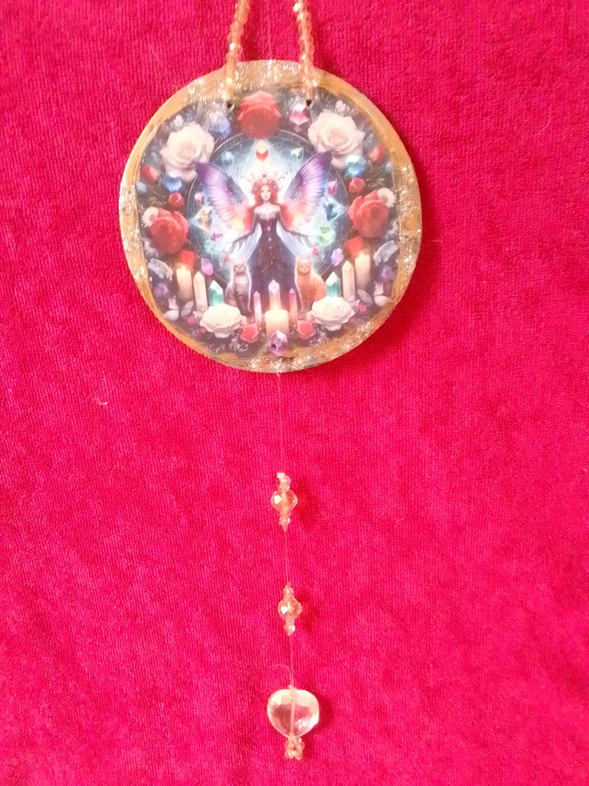 Fill your home with magic and light with this enchanting Fairy Suncatcher. Featuring a delicate fairy surrounded by sparkling crystals, graceful cats, and blooming roses, this piece captures the beauty of fantasy and nature in perfect harmony. A faceted, heart-shaped crystal hangs below, scattering rainbows across your space whenever it catches the sunlight.
