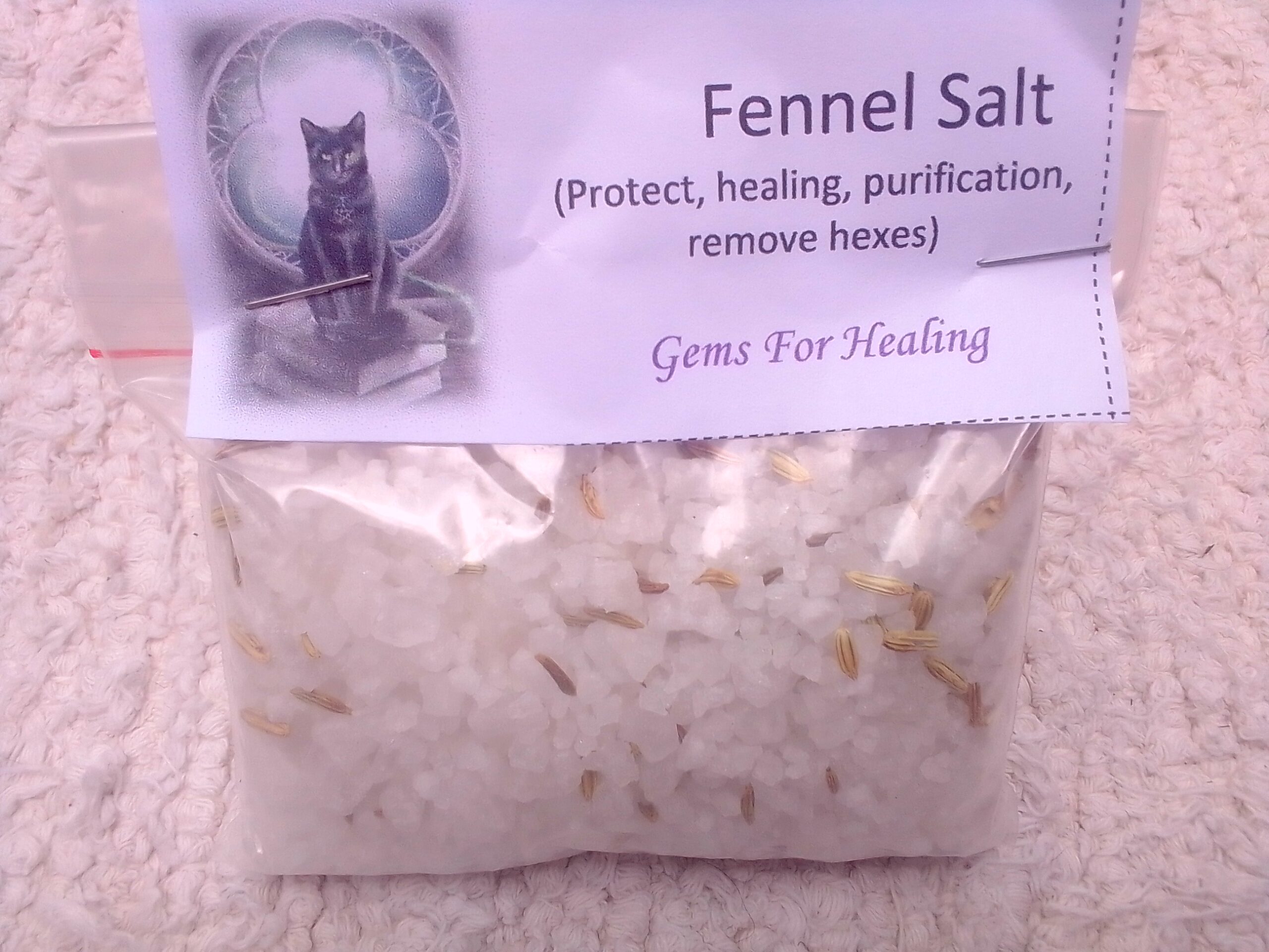 - Combine Fennel Salt with crystals and herbs in a bottle or pouch for protection and good fortune. Replace every month, washing and reusing the crystals.