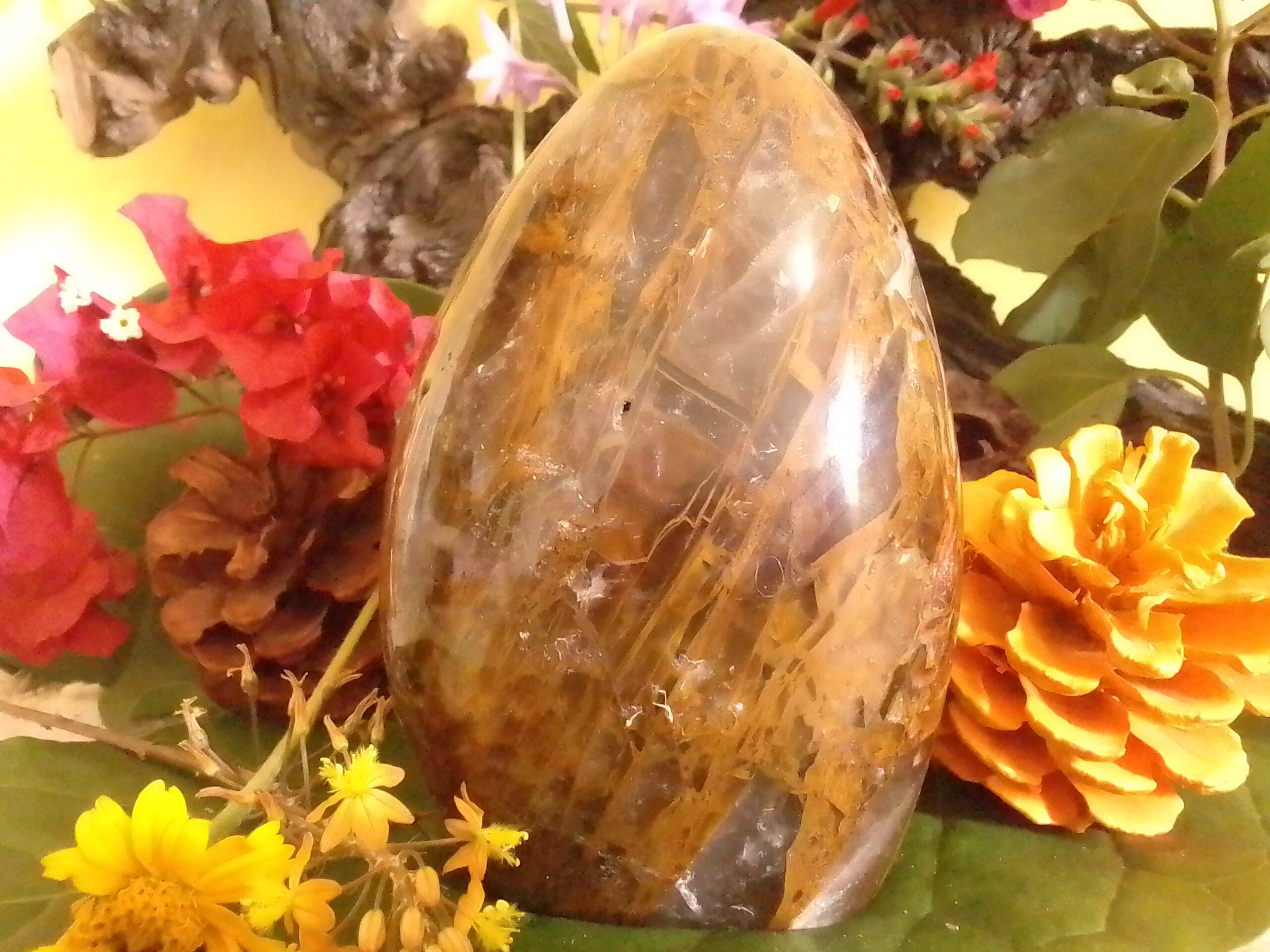 Enhances joy, balances yin and yang energies and aligns all chakras. Has a distinctive golden hue caused by a natural coating of iron oxide in between and under layers of quartz crystal.