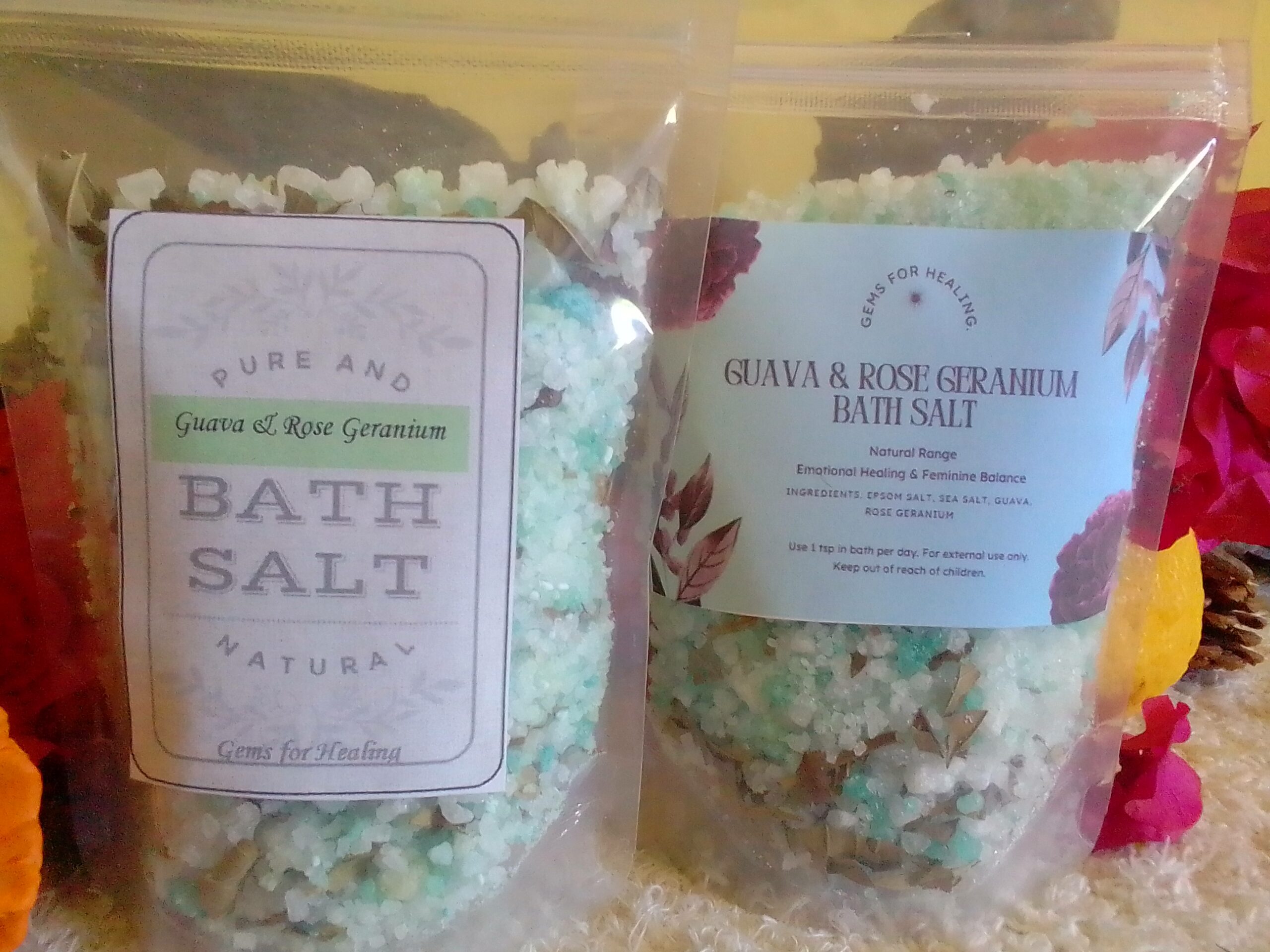 Epsom Salt, Sea Salt, Green Mineral Salt (food-grade colorant), Guava Leaves, Rose Geranium Essential Oil.