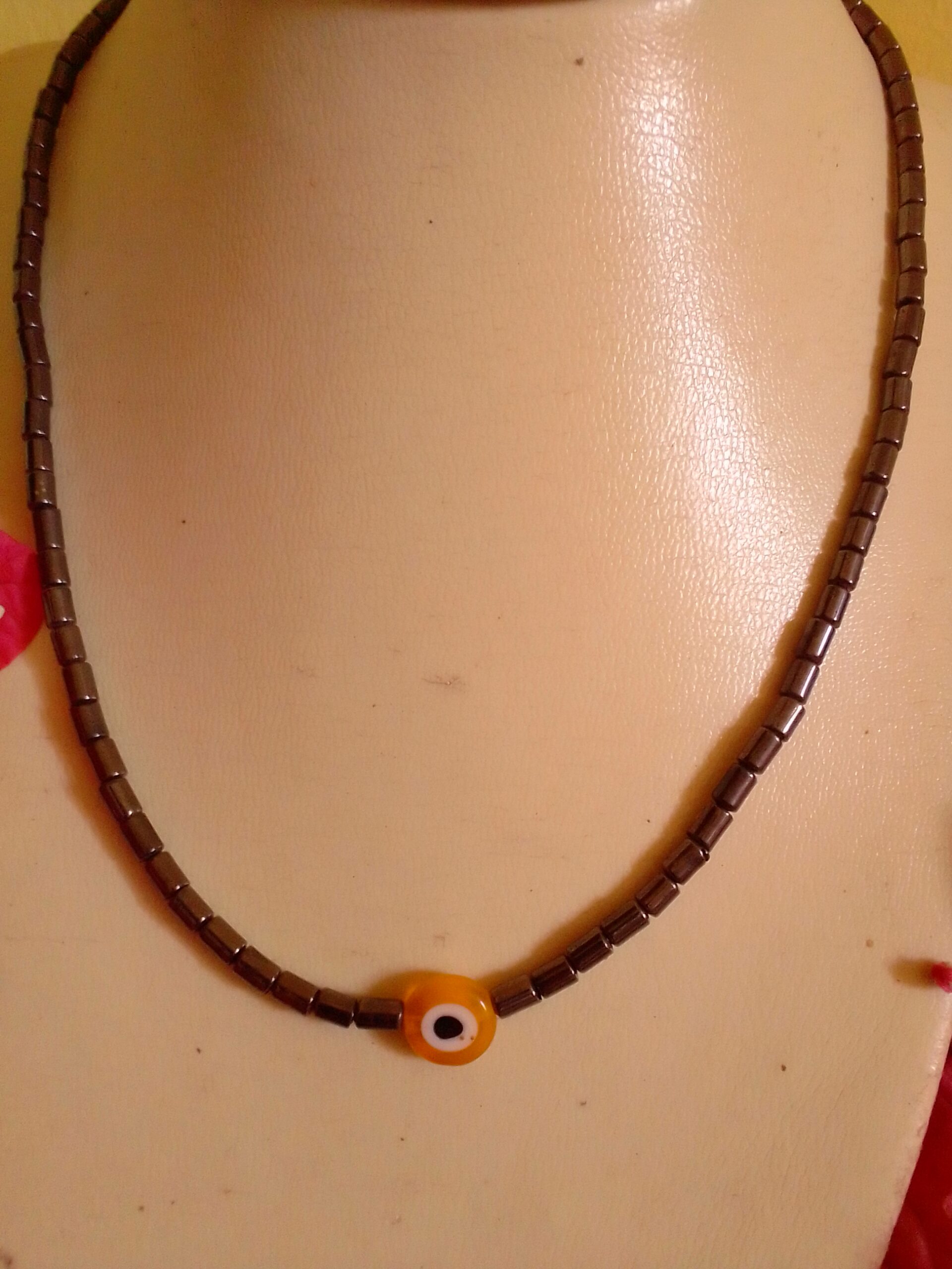Hematite & Evil Eye Necklace – Yellow: Break through any barriers that holds you back. Such as fear, inhibition, guilt, worry or self-doubt. An excellent stone for absorbing and grounding negative energy. Used to stop poltergeist activity and psychic disturbances. Astral travel, protect and grounding. Memory and studies. In addition, create a powerful connection with the Earth and is a useful stone for anyone who is becoming ‘spaced out’ by meditation or magical work.