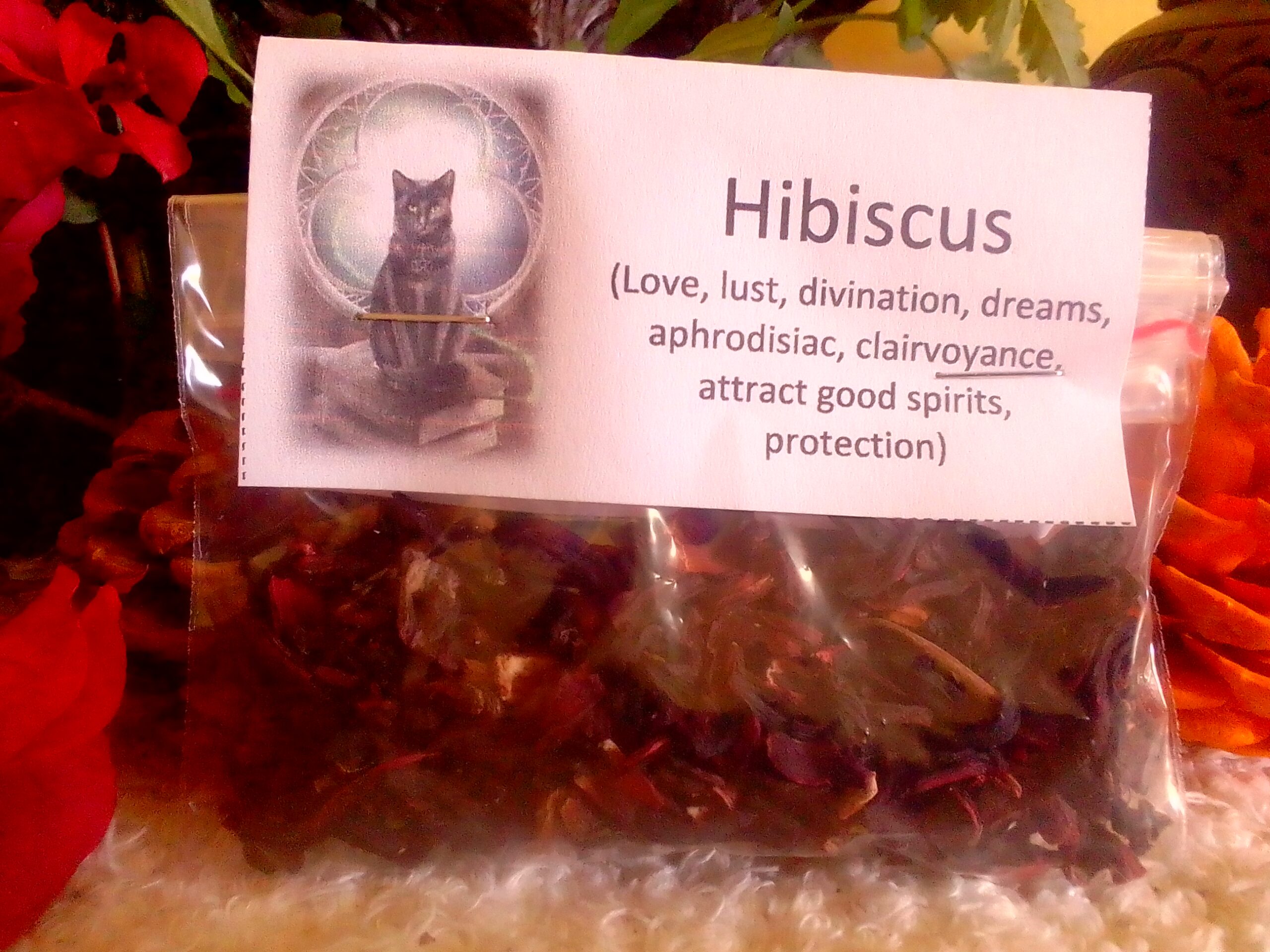 Magic: Attracting love and lust, divination, and dreams. Carry in a sachet or burn as incense to attract love. As an aphrodisiac. Use this herb for spells dealing with love or lust or put into a sachet to bring on passion and love. Hibiscus is also used in incense mixtures for divination and clairvoyance. Hibiscus aid divination when placed in a wooden bowl containing water, and the result is scryed. It is also used as a protection against negativity and evil. It facilitates psychic abilities and attracts good spirits.