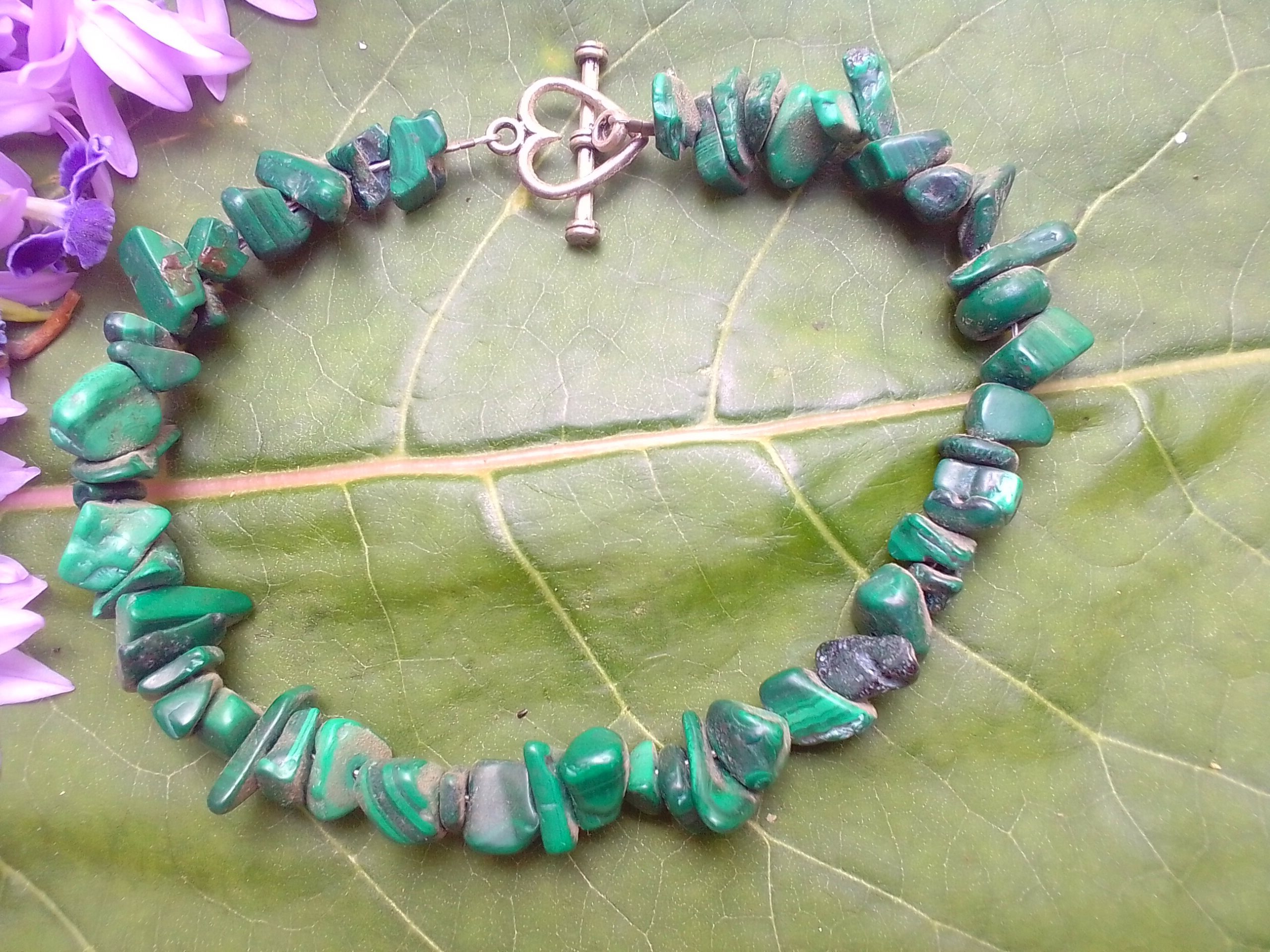 Health: Regulate the menstrual cycle, cramps, easing labor, sexual discomfort caused by traumatic past experiences. Malachite chip stone bracelet relieves cold sweats, malaria, trembling, Parkinson’s disease, asthma, intestinal problems, rheumatic pain, osteoarthritis, strengthens memory, treat kidney and gallstones, lower blood pressure, treats epilepsy, travel sickness and vertigo. Heals fractures, swollen joints, tumors, torn muscles, broken bones, enhance the immune system and stimulates the liver to release toxins. Mentally Malachite goes to the root of the problem. Use in animals for heart and liver.