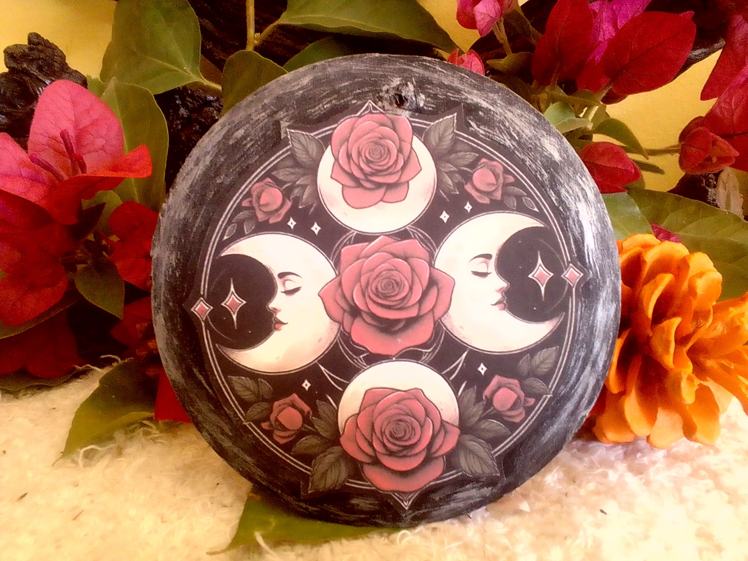 Handmade Round Moon Goddess Ash Catcher – Black & Silver with Roses