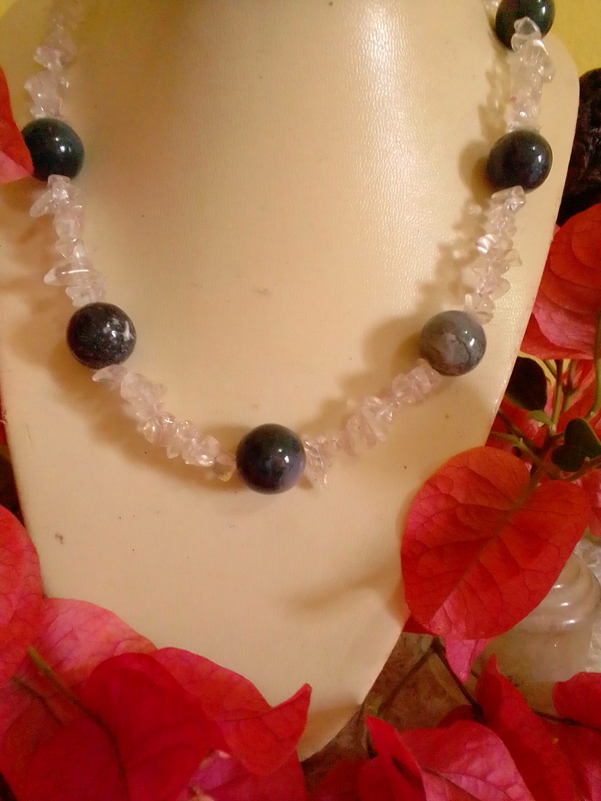 Wearing clear quartz and moss agate together in a necklace blends clarity with grounding harmony. In crystal lore, clear quartz is thought to amplify energy and focus, while moss agate is associated with balance, abundance, and a deep connection to nature. Paired, they’re often seen as a symbol of steady growth and clear intention — a beautiful way to carry gentle inspiration and earthy calm throughout your day. Also see Chunky Clear Quartz Necklace with Plated Heart