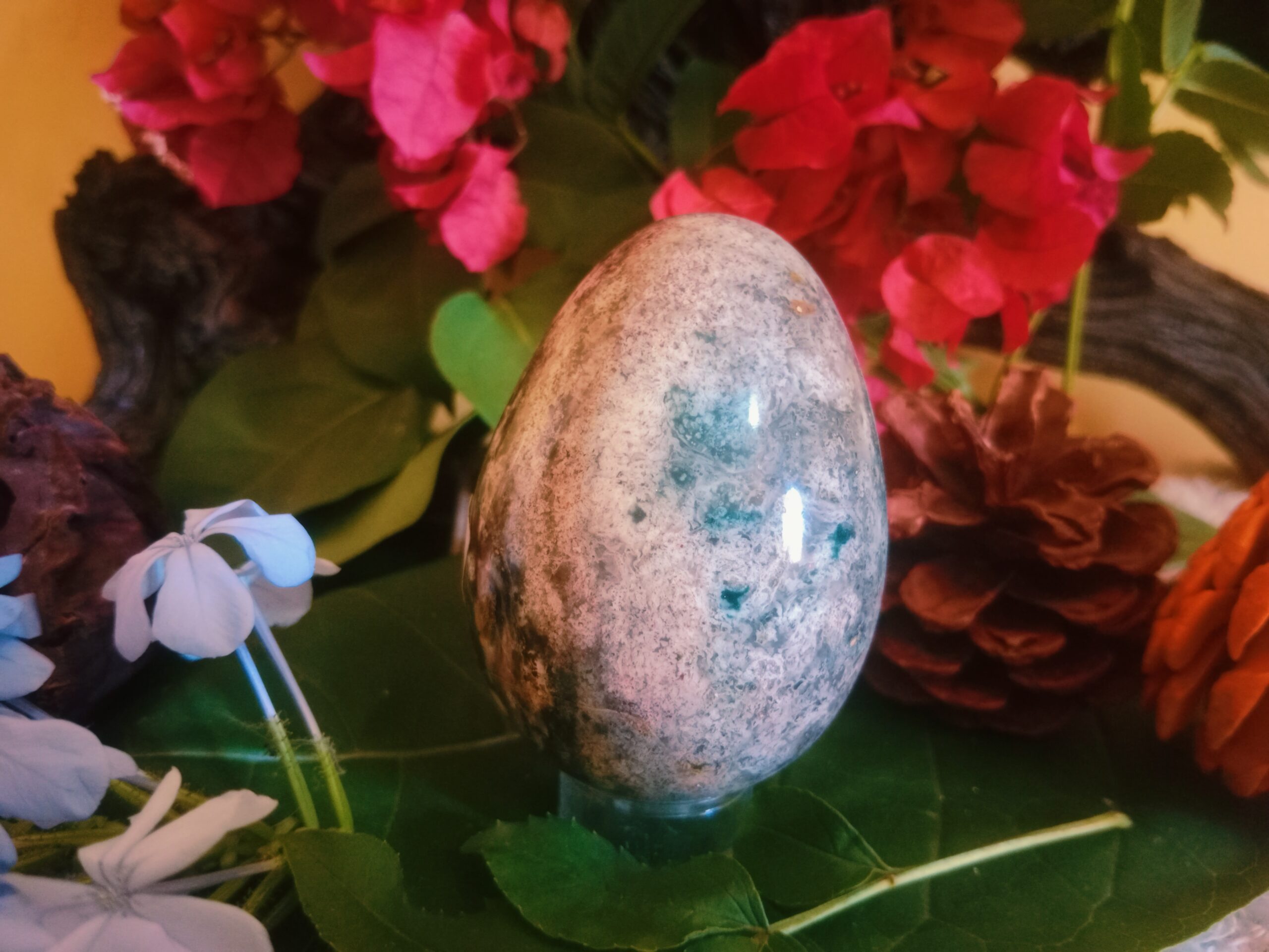 Ocean Jasper egg draws its power from the element Water. It is a stone of strength and renewal with a slow, steady frequency. And a deep circular energy that embodies the inter-connectedness of all things. Its spherical pattern are a spiritual reminder of how thoughts, words and actions interact in our world and flow in a circular direction. It honors the principle that what one sends out will indeed return.