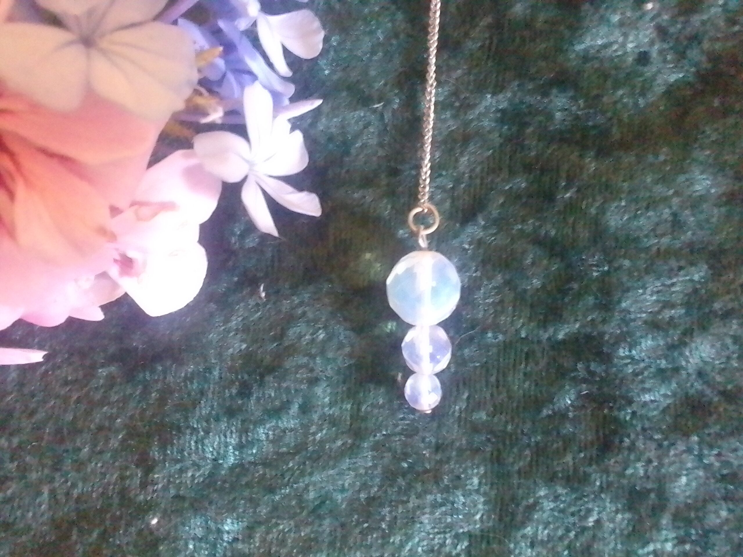 Discover the enchanting Opalite Bead Pendulum, a beautiful tool designed to enhance your spiritual practice and intuitive abilities. Crafted from man made opalite beads. This pendulum features a stunning, translucent quality that captures the light and creates a captivating glow. Its calming energy and vibrant hues make it not only a functional tool for divination but also a stunning piece of art.