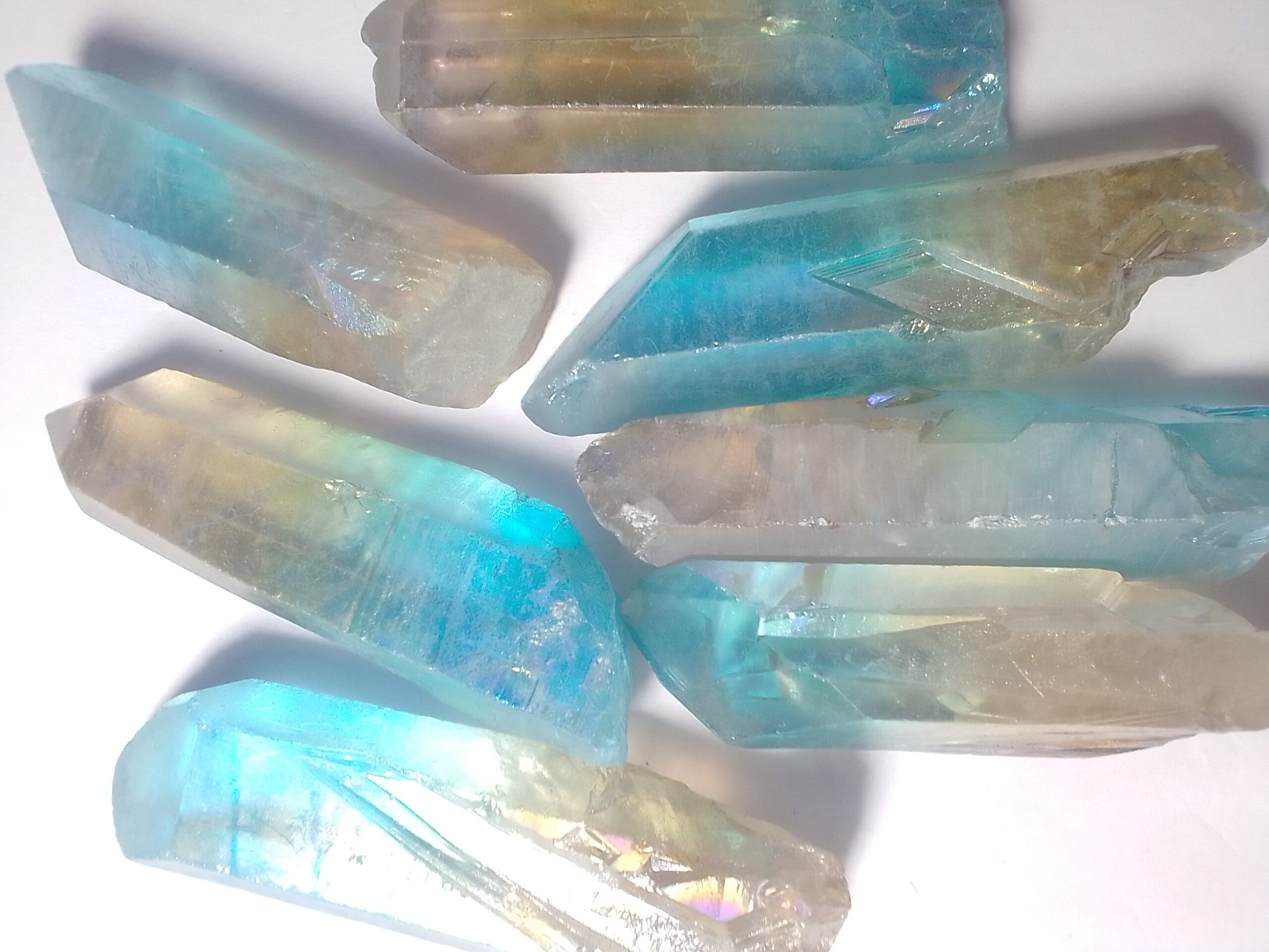 Aura Quartz crystals are extraordinary stones for healing crystal grids, activating the Light body and grounding it in the physical body. Laid along the chakras like a rainbow, the various colors raise the vibrational rate of the chakras to accommodate expanded consciousness. They align and purify the entire system, allowing for “Rainbow Light Body” activation and integration.