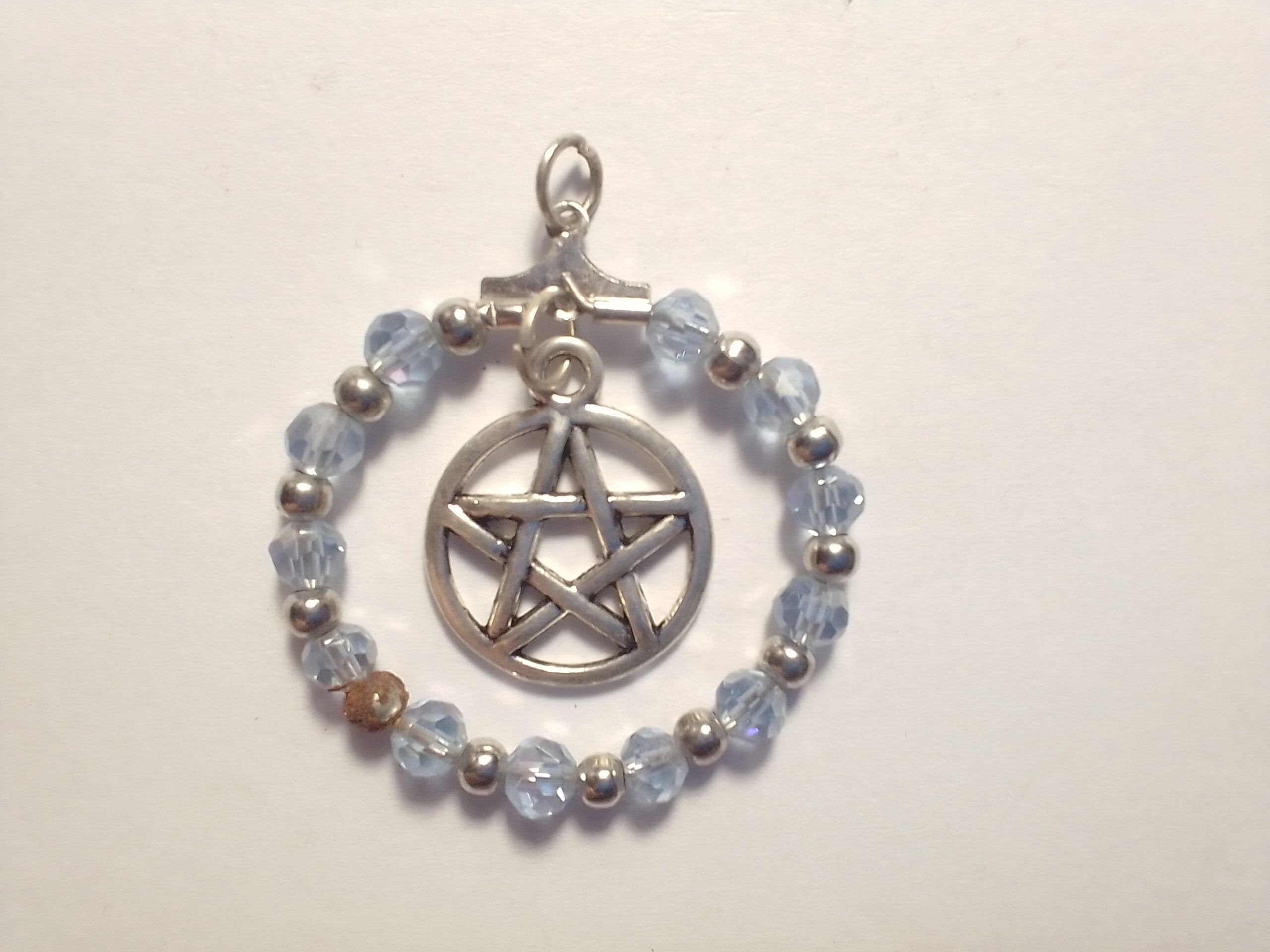 A pentagram light blue pendant is the shape of a five-pointed star. Pentagram used symbolically in ancient Greece and Babylonia. And today as a symbol of faith by many Wiccan, akin to the use of the cross by Christians and the Star of David by Jews.