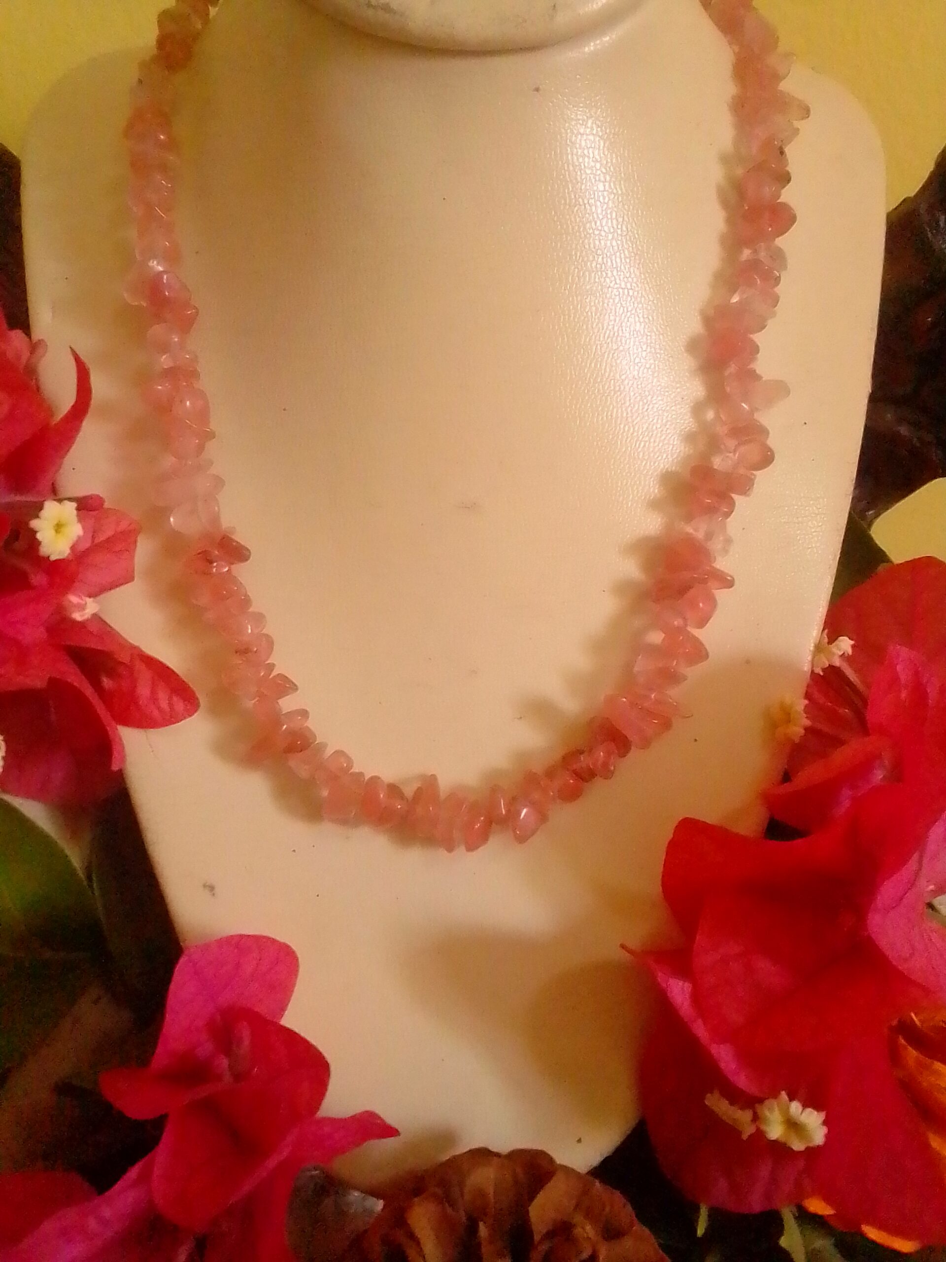 Enhance your energy and emotional well-being with our Pink Obsidian Chip Necklace, also known as Strawberry Obsidian or Cherry Quartz. This captivating stone, with its luscious red hues reminiscent of volcanic fire, is a powerful tool for grounding and balance. Pink Obsidian stimulates the Root Chakra, boosting physical energy and helping you face fears and anxieties with strength and confidence.