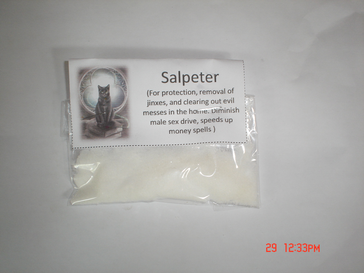 Saltpeter: For protection, removal of jinxes, and clearing out evil messes in the home. Diminish male sex drive, speeds up money spells. Folk Names: Nitre, Niter, Saltpetre, Salt Peter, Salt Petre, Nitrate of Potash, Nitron, Nitrion.