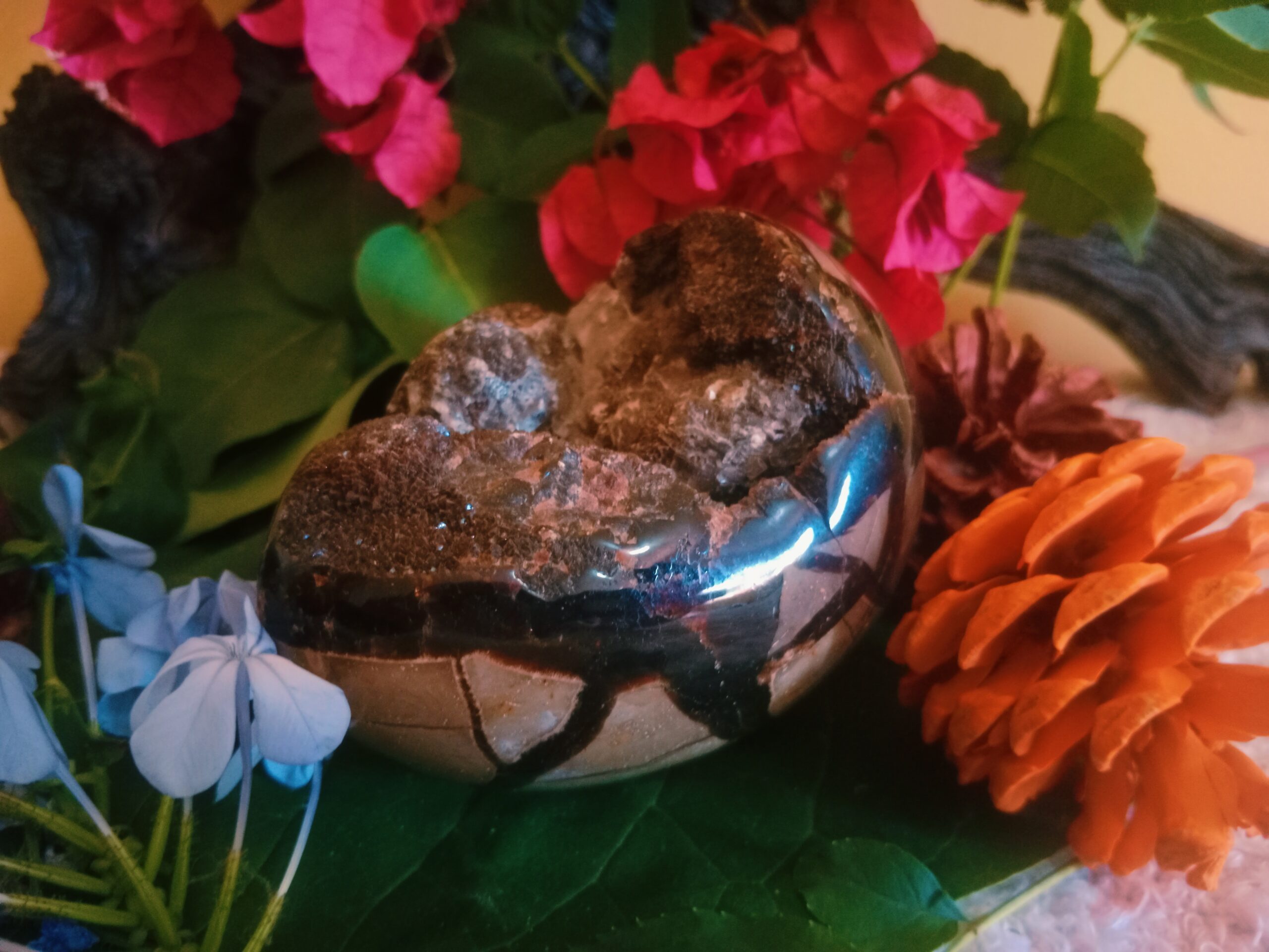 Septarian is a “concretion” stone. Concretions are protective stones, providing both grounding and shielding of the physical, mental, and emotional bodies. It is a stone for regulation of spiritual, mental, and physical prowess. It promotes both calming and understanding on the emotional level.