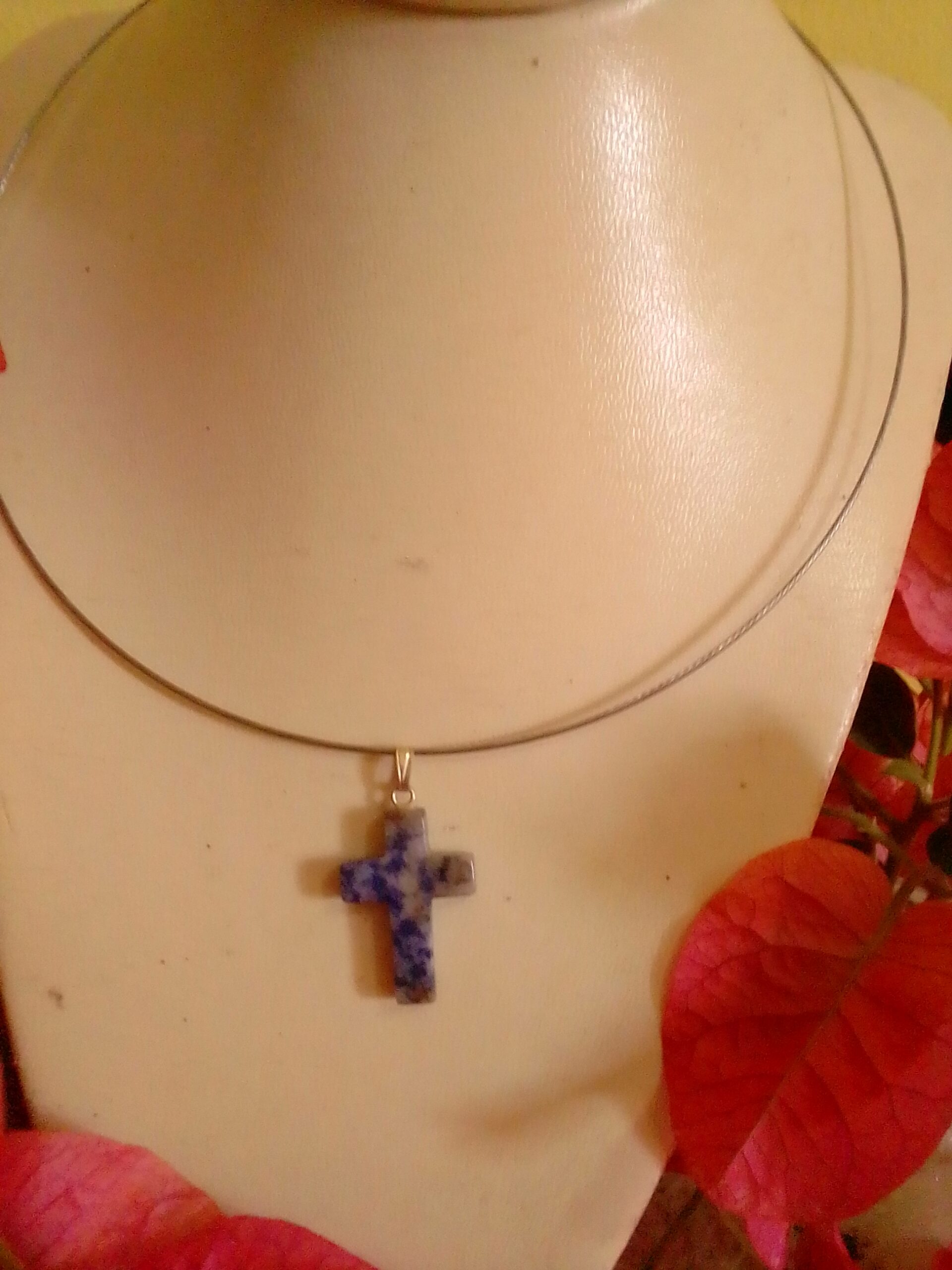 Sodalite cross choker awaken the 3rd Eye. Help develop second sight or psychic powers. Sodalite is an ideal stone for those who are oversensitive, defensive, impulsive, or prone to anxiety or panic attacks. Stabilize the mind and allow a shift from emotional to rational.