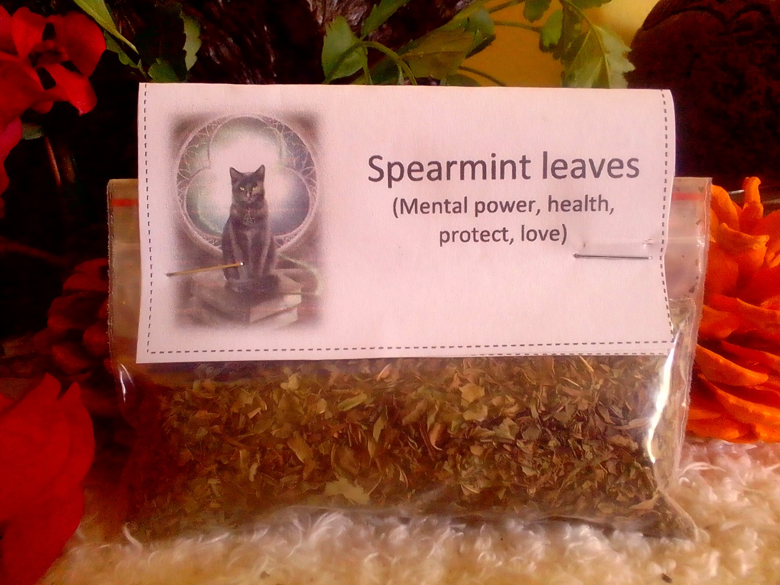 Magic: Spearmint is a refreshing herb filled with cleansing, healing, and protective energy. Clear negativity, attract prosperity, enhance psychic awareness, and promote love and harmony. Its uplifting vibration makes it perfect for spells of renewal, peace, and balance. Spearmint Leaves is used in all healing applications, especially in aiding lung diseases. Smelled, spearmint increases and sharpens mental powers. For protection while asleep, stuff a pillow or mattress with spearmint. Add to love spells.