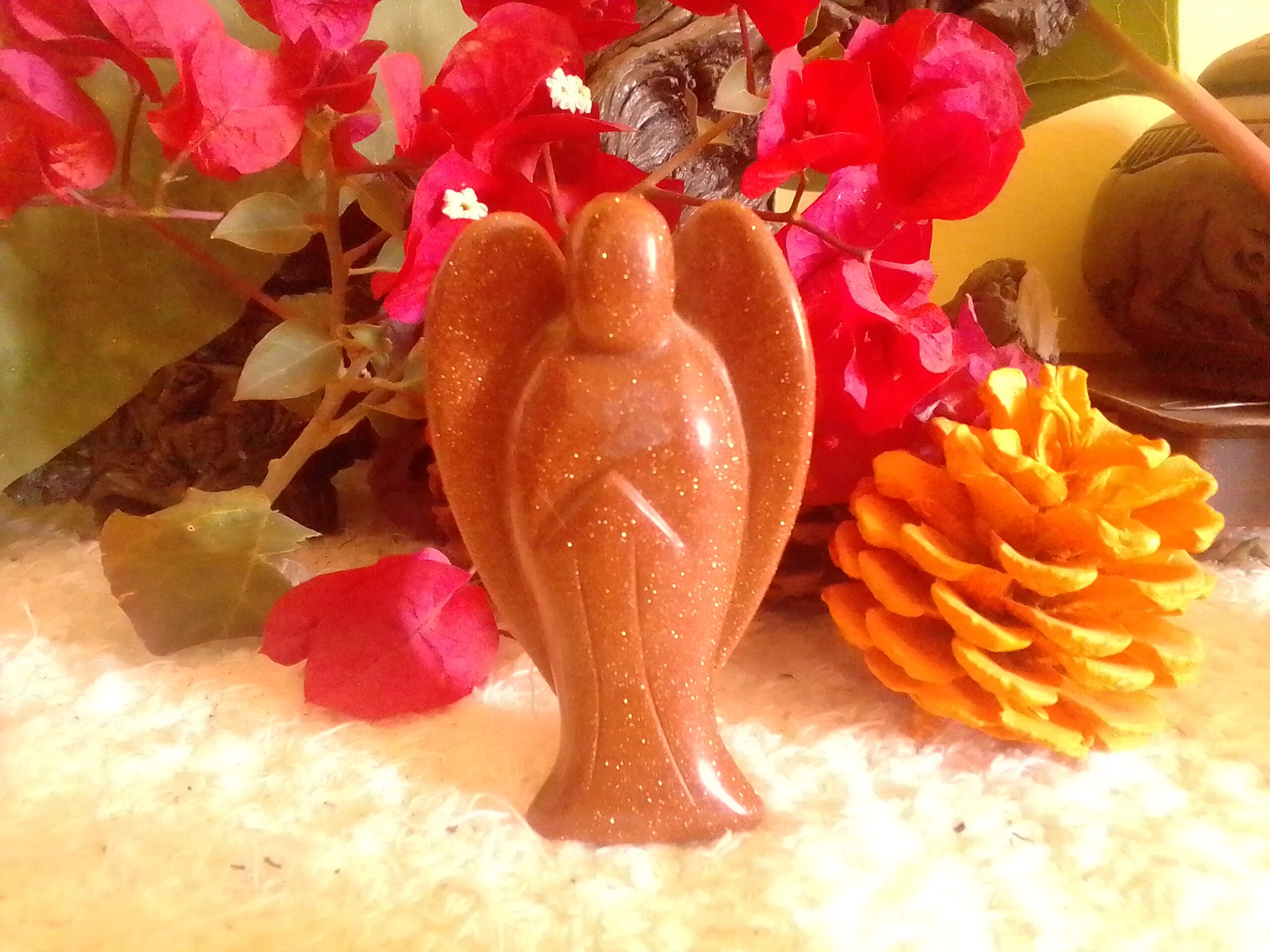 Sunstone | Goldstone Large Stone Angel, known by many names: “aventurine glass,” stellaria, gold star glass, monkstone or monk’s gold.
