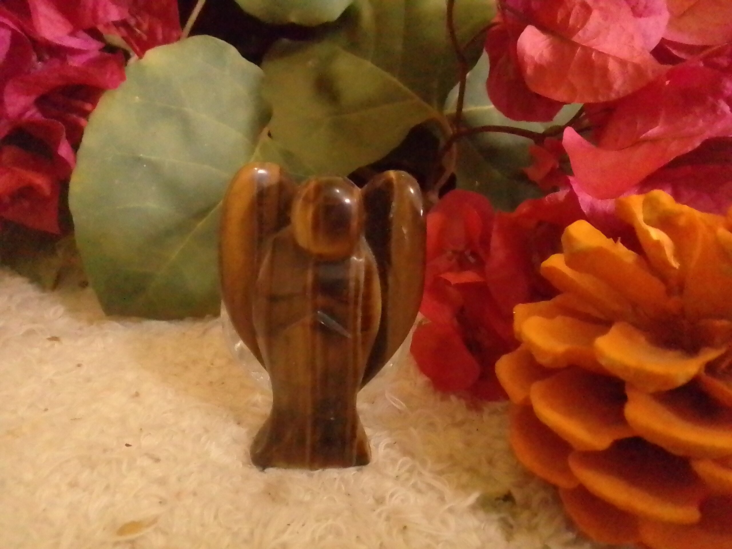 Tigers Eye Medium Stone Angel Treats eyes, night vision, heals the throat and reproductive organs. Dissolve constrictions. Use to help heal broken bones. It is a blood fortifier, and to assist in bringing biochemistry and hormones into balance.