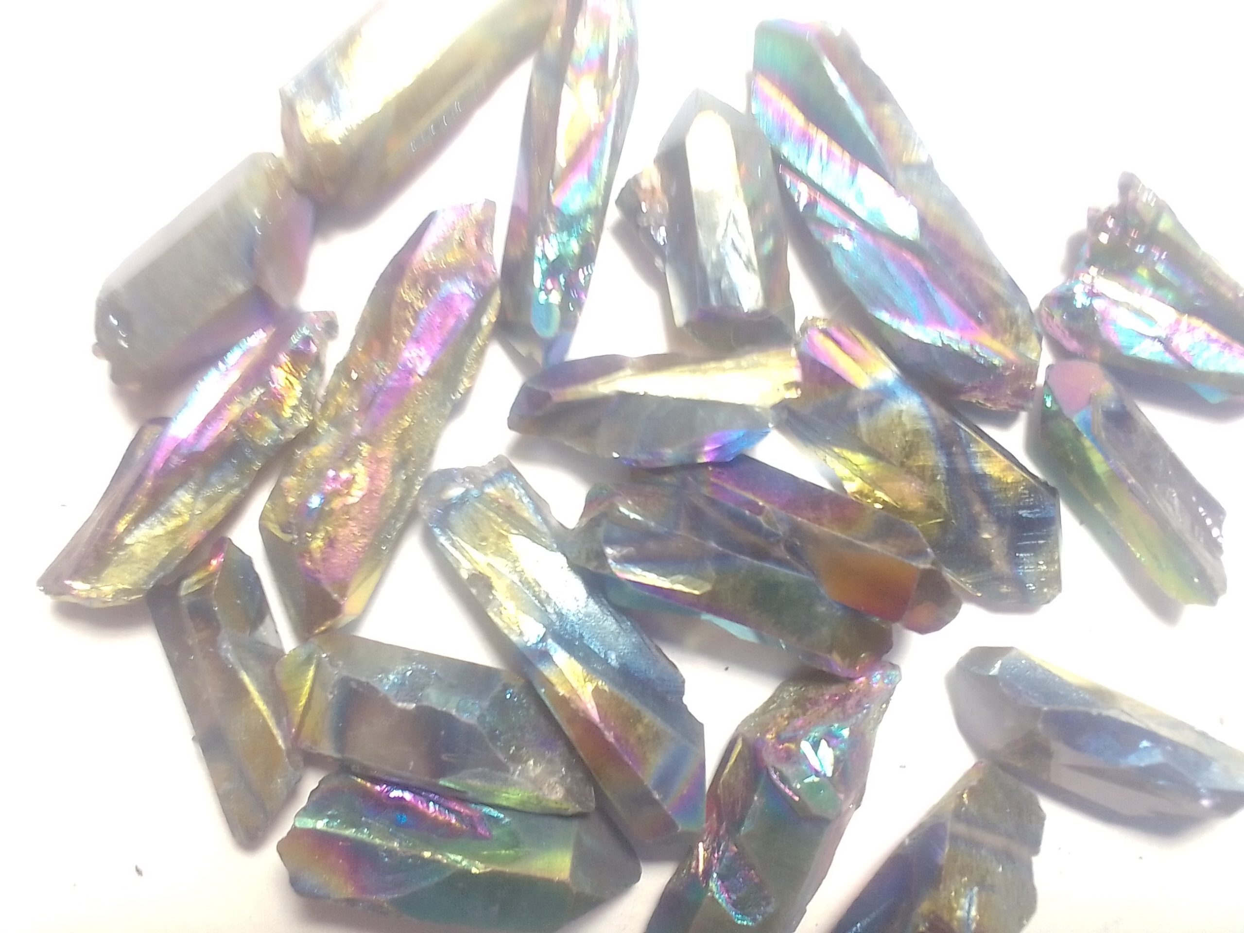 Titanium Aura Quartz Rough Stone (2-3cm) crystals are extraordinary stones for healing crystal grids. Activating the Light body and grounding it in the physical body. Laid along the chakras like a rainbow, the various colors raise the vibrational rate of the chakras to accommodate expanded consciousness. They align and purify the entire system, allowing for “Rainbow Light Body” activation and integration.